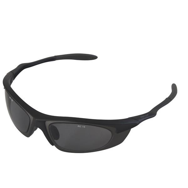 Constituído de armação modelo convencional de material plástico preto, lentes de policarbonato cinza;