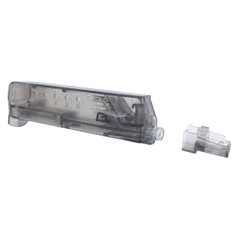 Produzido em polímero de alta resistência, tem capacidade para até 90 BBs de calibre 6mm.