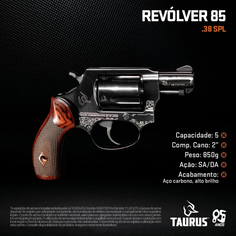 Modelo: Revólver Taurus RT 85 Calibre .38 SPL  – Edição 85 Anos Limitada