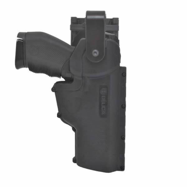 Possui catraca rotativa, permitindo a angulação do Coldre em sua base, facilitando o manuseio da arma;