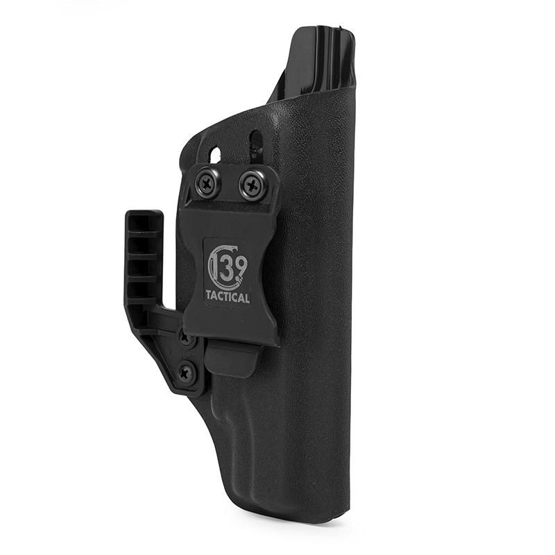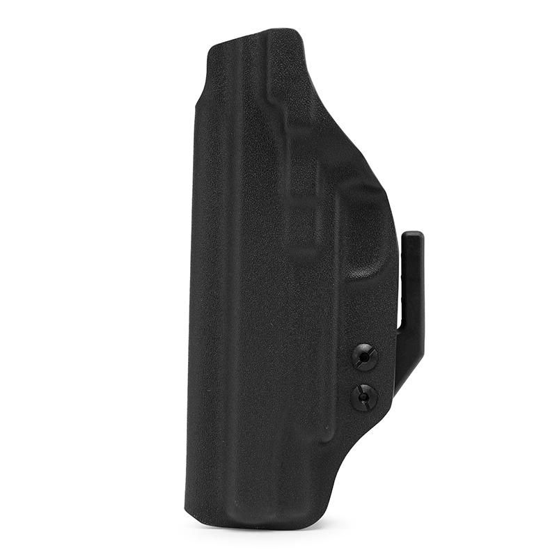 O Kydex® não deforma, sendo extremamente durável e leve. Com duas opções de clip, um em polímero (POM), muito resistente, e outro clip metálico em aço inoxidável, com ajuste de ângulo. Ambos os clips possuem regulagem de altura.