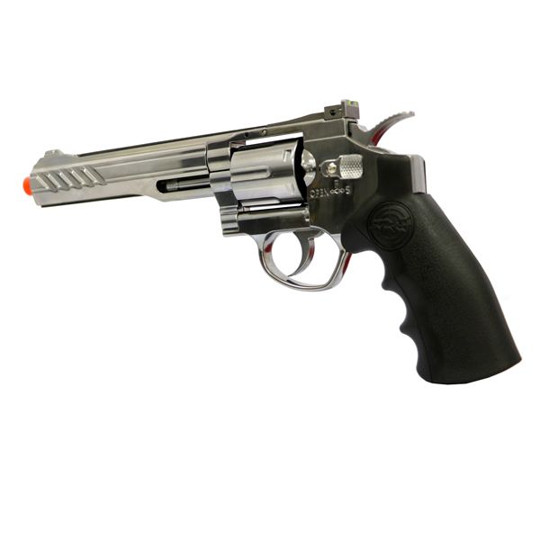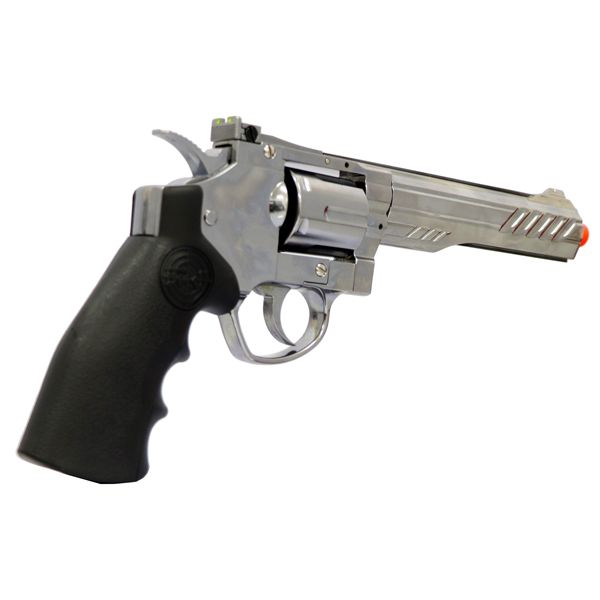 Entretanto este revolver é alimentado por CO2 e tem uma ação dupla de seis tiros, um design de cilindro com abertura para fora, liberação do cilindro de pressão para balançar o cilindro, um cilindro de tração para alternar para a construção de metal e plástico.Tem uma estrutura de liga leve e visão traseira ajustável vem com cano exterior de liga com uma vista frontal.Ele vem com cilindro de metal e haste ejetora que pode conter seis conchas. Portanto a empunhadura de plástico cobre do revolver co2 com marcação “SRC”, possui também um gatilho de metal, martelo e liberação de cilindro.