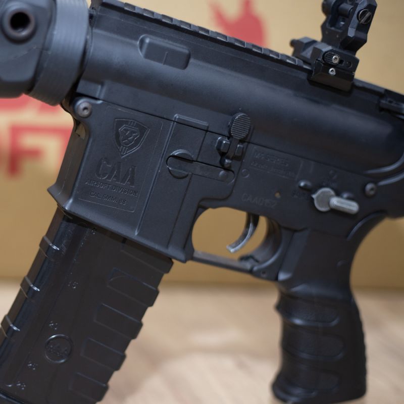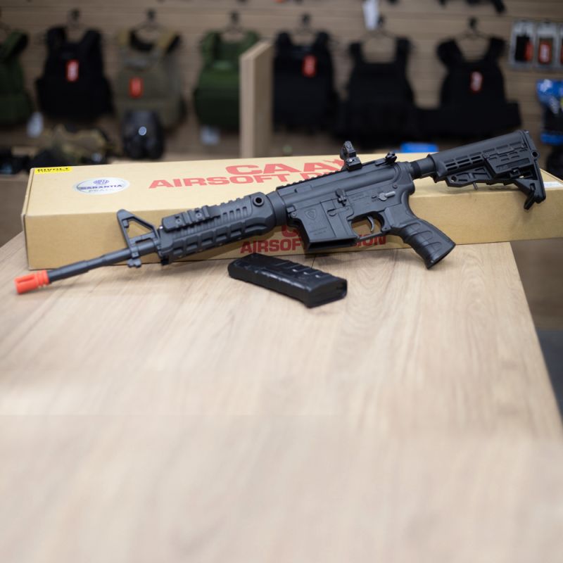 O rifle de airsoft do M4A1 CAA Custom, equipamento produzido pela CAA, com funcionamento elétrico e feito com polímero reforçado em fibra de nylon de alta resistência.