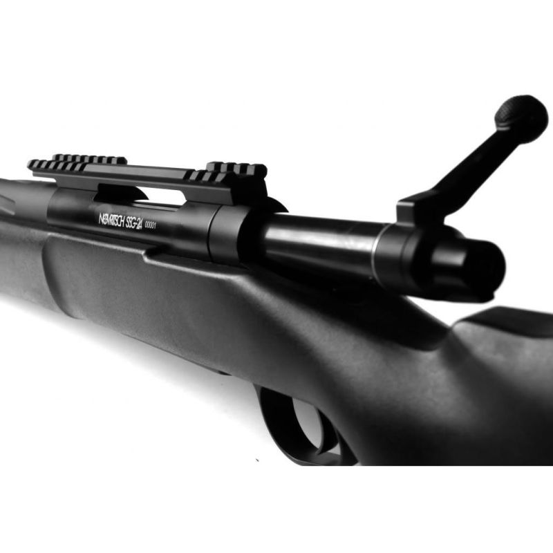 Todo o receptor é feito de metal e possui seu número de série individual Novritsch SSG24. O receptor contém dois anéis deslizantes POM que garantem uma tração suave e fácil dos parafusos. O trilho Picatinny estendido na parte superior é montado com quatro parafusos de aço no receptor. Debaixo do parafuso dianteiro do trilho, encontra-se um parafuso rosqueado que garante que o cano externo não possa girar.